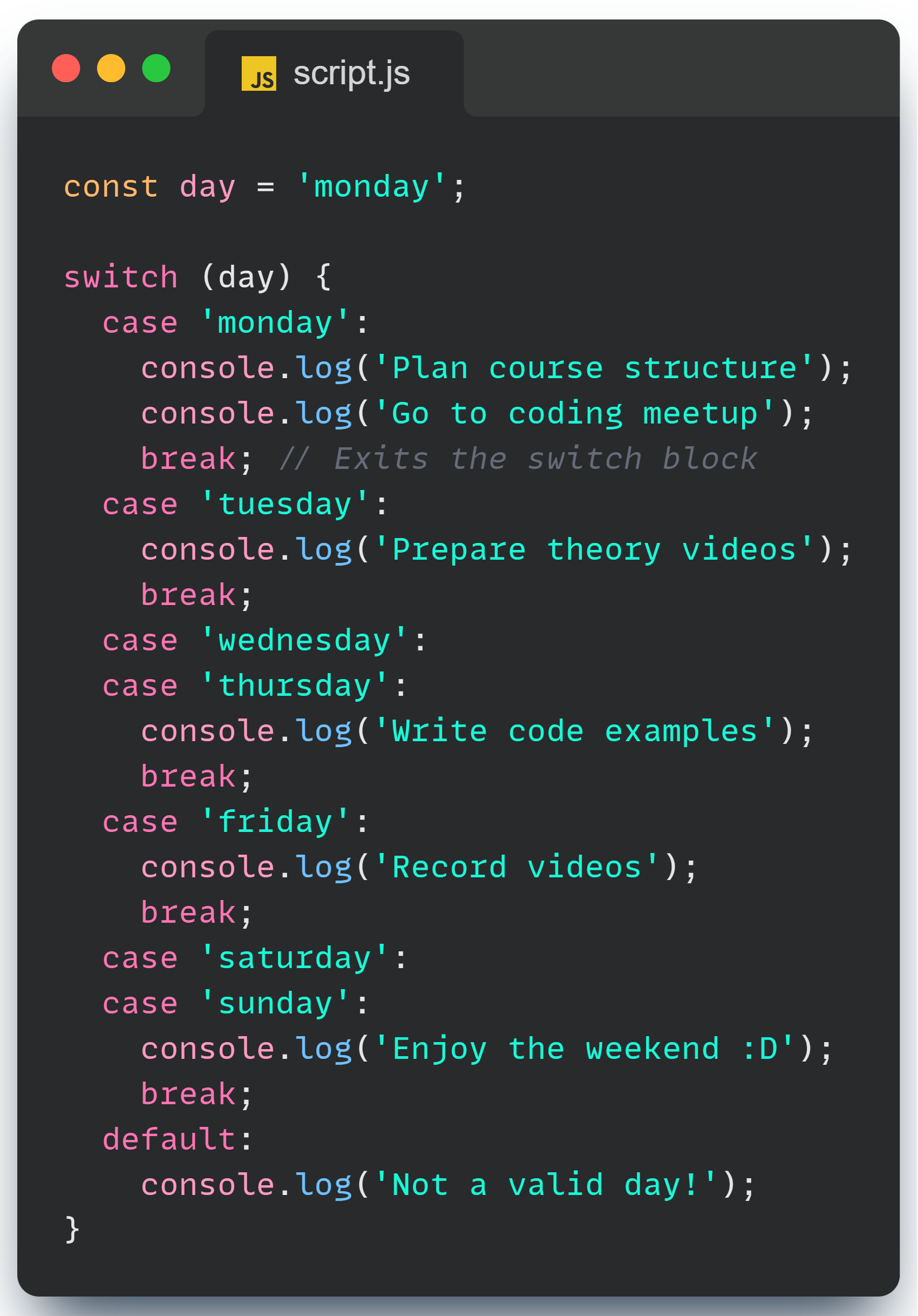 Imagine you’re planning out a week of tasks and you want to decide what to do based on the day of the week. The switch
