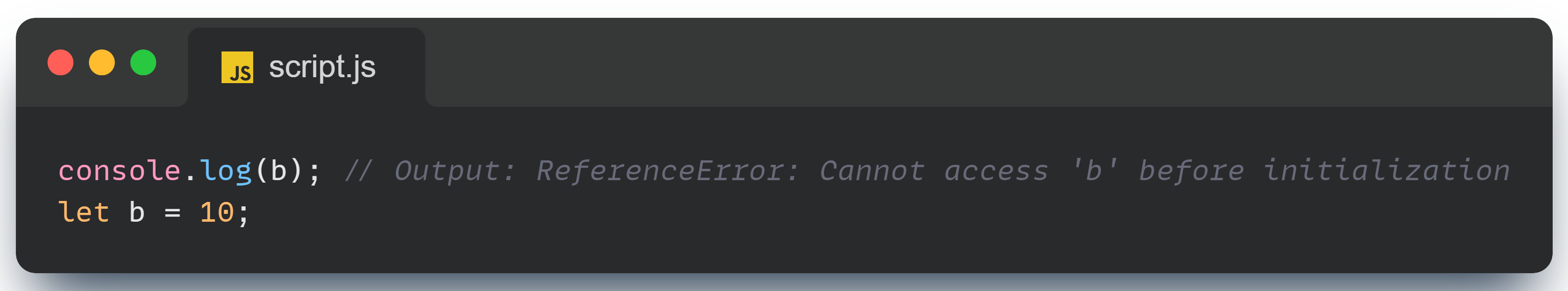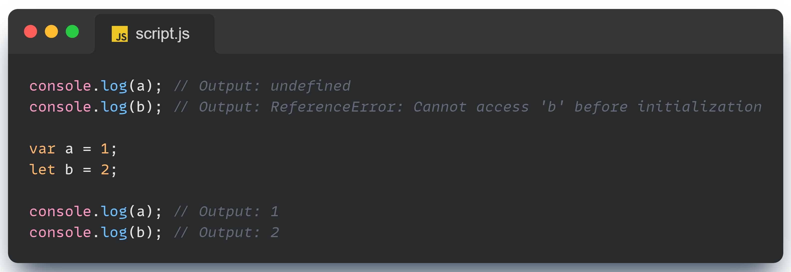 introduces a temporal dead zone, making it clear that you cannot access these variables before their declaration. This can help avoid issues that arise from accessing variables too early.