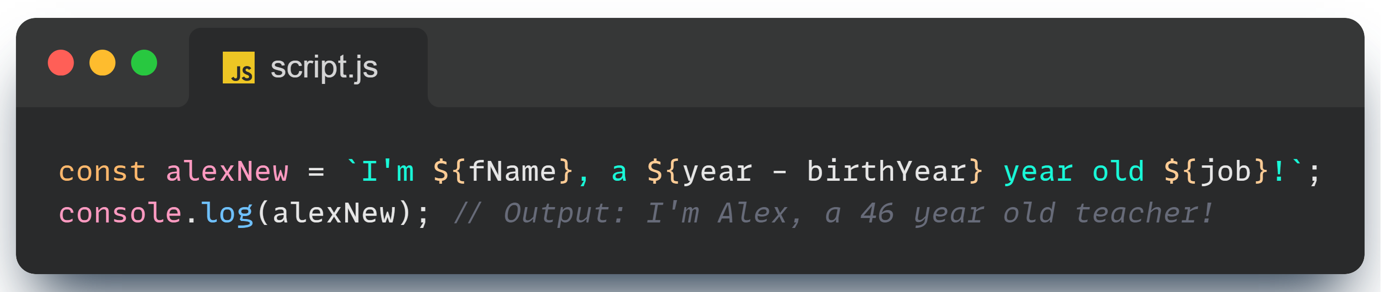 signs and quotation marks to juggle, right? It works, but it’s not exactly elegant. Lets introduce template literals — a feature that’s as cool as it is powerful. Using template literals, you can write the same thing in a cleaner, more readable way: