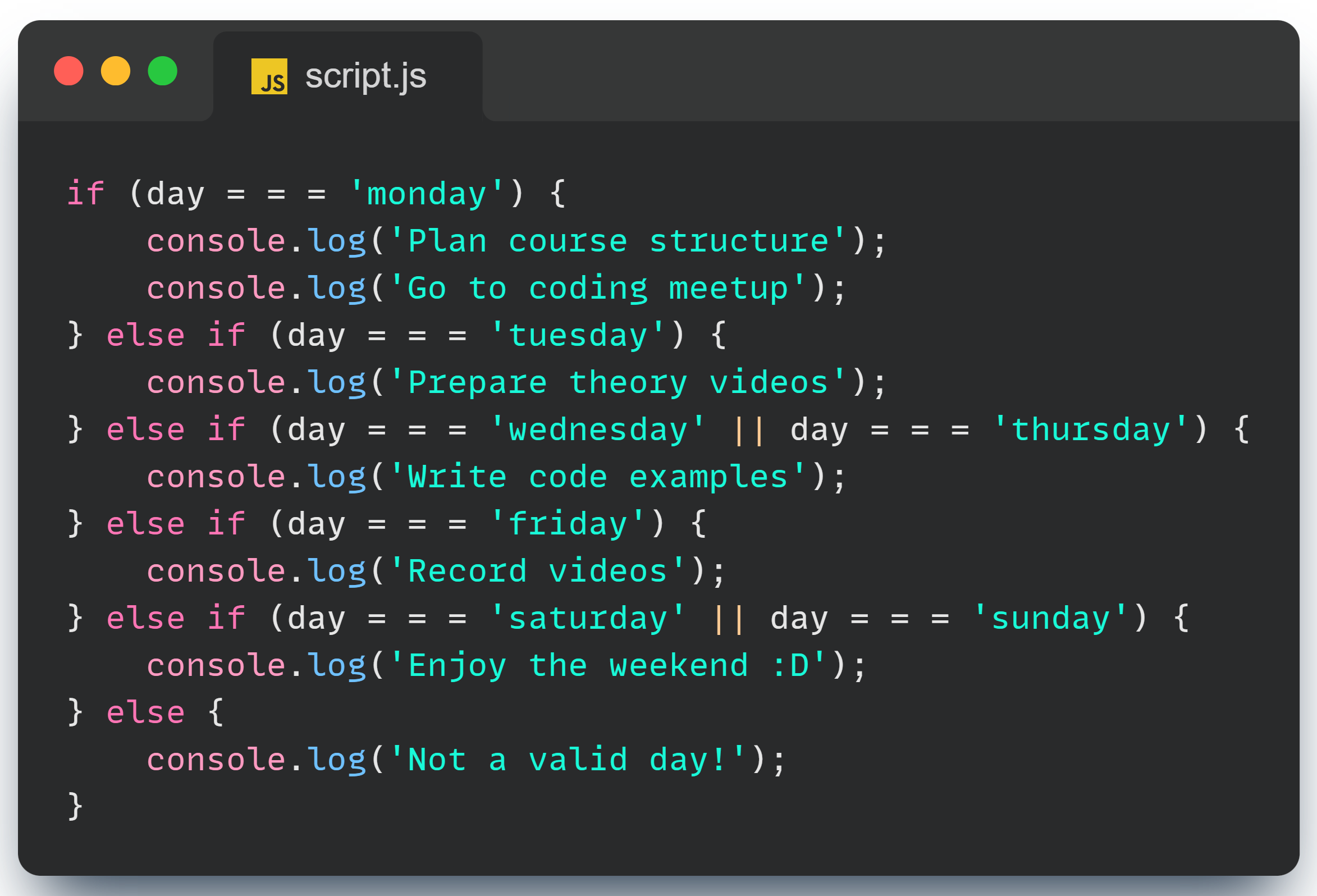 , and so on.else if (day === 'wednesday' || day === 'thursday')